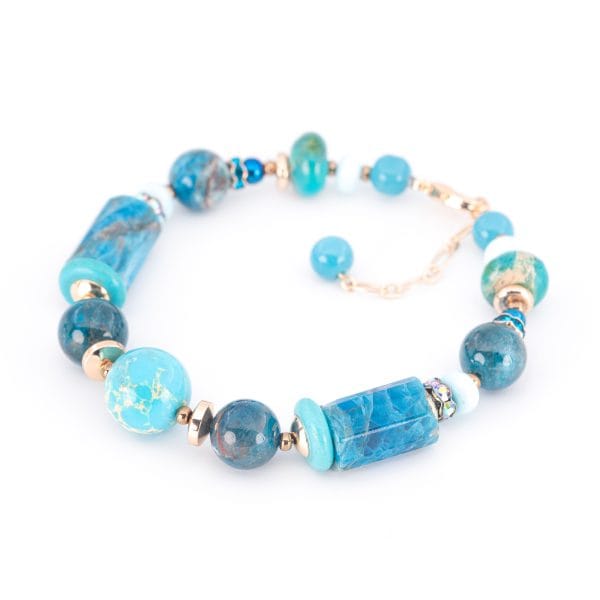 Апатит даёт прозрачную глубину и яркость, варисцит добавляет мягкие природные прожилки, а яшма собирает композицию, привнося плотность цвета и характер. Вместе они создают ощущение морского пейзажа: где-то спокойная гладь, где-то насыщенные, почти штормовые акценты.