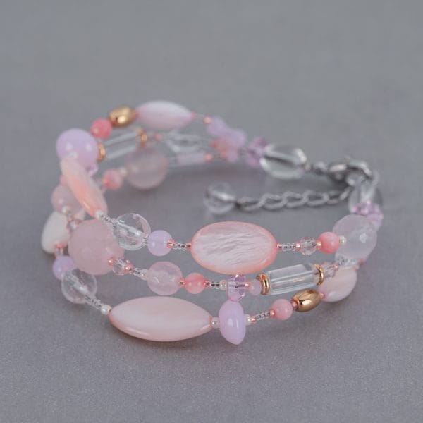 Розовая палитра раскрывается в оттенках от насыщенного до пудрового, а прозрачные и более тёмные вставки добавляют глубину. Небольшие контрастные элементы делают рисунок выразительным, но не перегружают его. За счёт трёх рядов браслет выглядит объёмно, при этом остаётся лёгким и подвижным на руке.