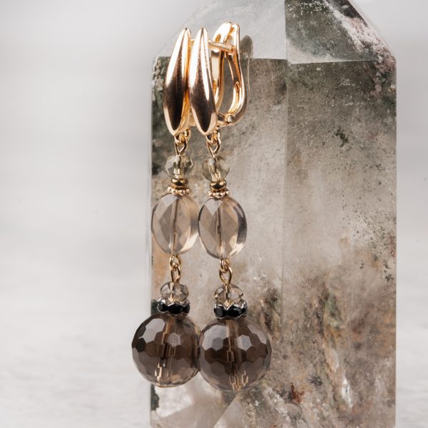 Крупные шары раухтопаза задают ритм и глубину. Камень тёплого дымчатого оттенка выглядит благородно и собранно, с мягким внутренним свечением. Грани стеклянных бусин добавляют света и движения, а золотистые вставки создают ощущение продуманной роскоши, без показной яркости. Украшение объёмное, заметное, но при этом гармоничное и хорошо сбалансированное.