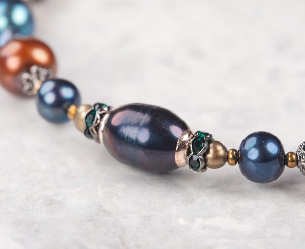 3000 ₽Браслет из натурального жемчуга — сине-фиолетового, белого и коричневого оттенков. Мягкое сочетание цветов создаёт спокойное и гармоничное настроение. Декорирован блестящими стразами и мелким бисером, который добавляет лёгкое мерцание.