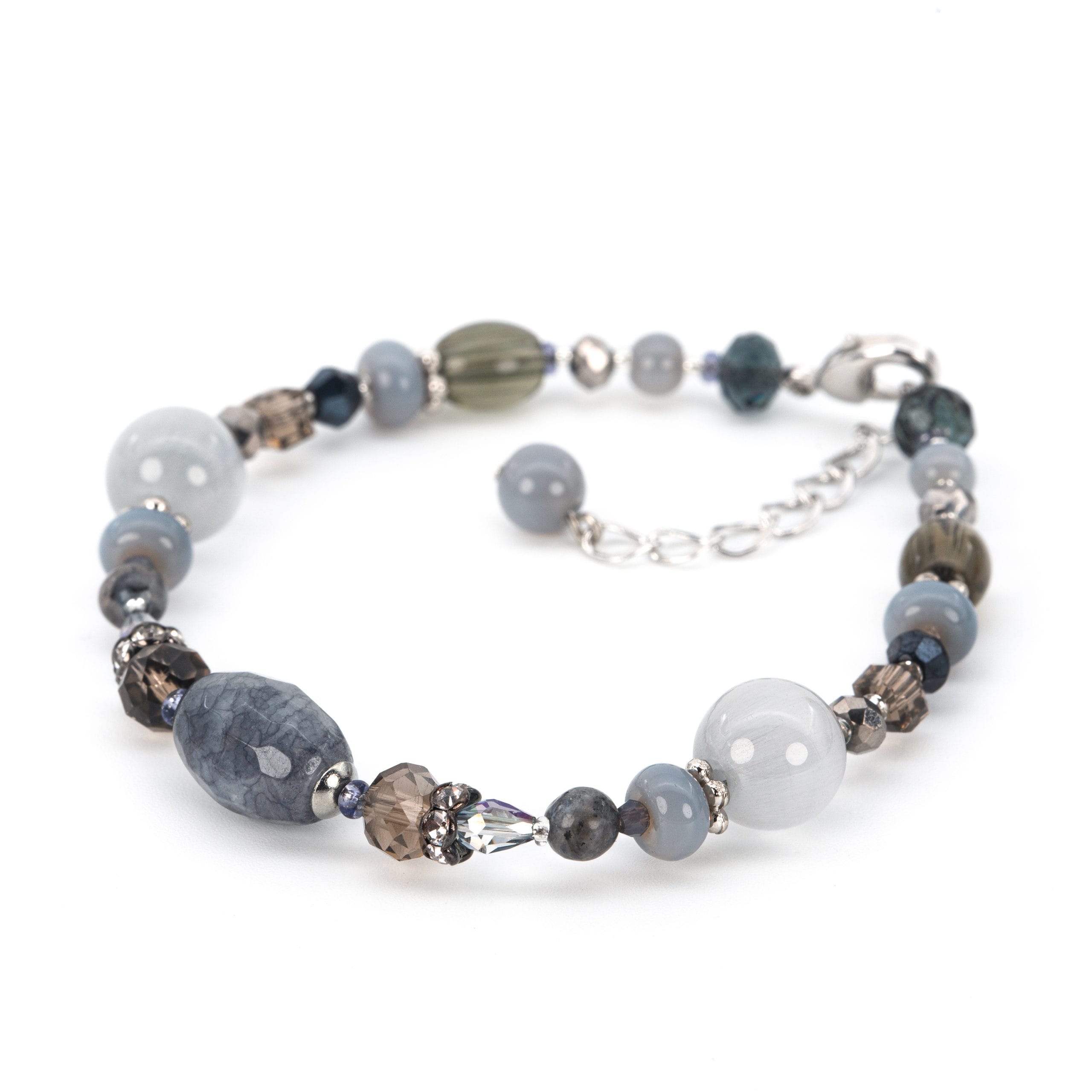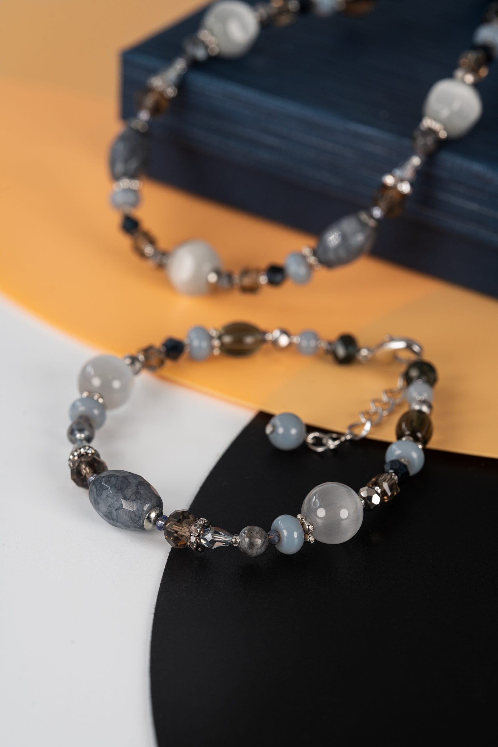 3500 ₽Бусы «Енисей» выполнены в мягкой серо-дымчатой гамме, где каждый камень играет свою роль. Кварц и раухтопаз создают спокойное и глубокое звучание, кошачий глаз добавляет переливы, а огранённые бусины и стразы – мерцающий акцент. Лёгкая белая фурнитура завершает композицию, придавая ей чистоту и утончённость. Украшение подчеркнёт повседневный образ и станет ненавязчивой деталью для делового стиля.