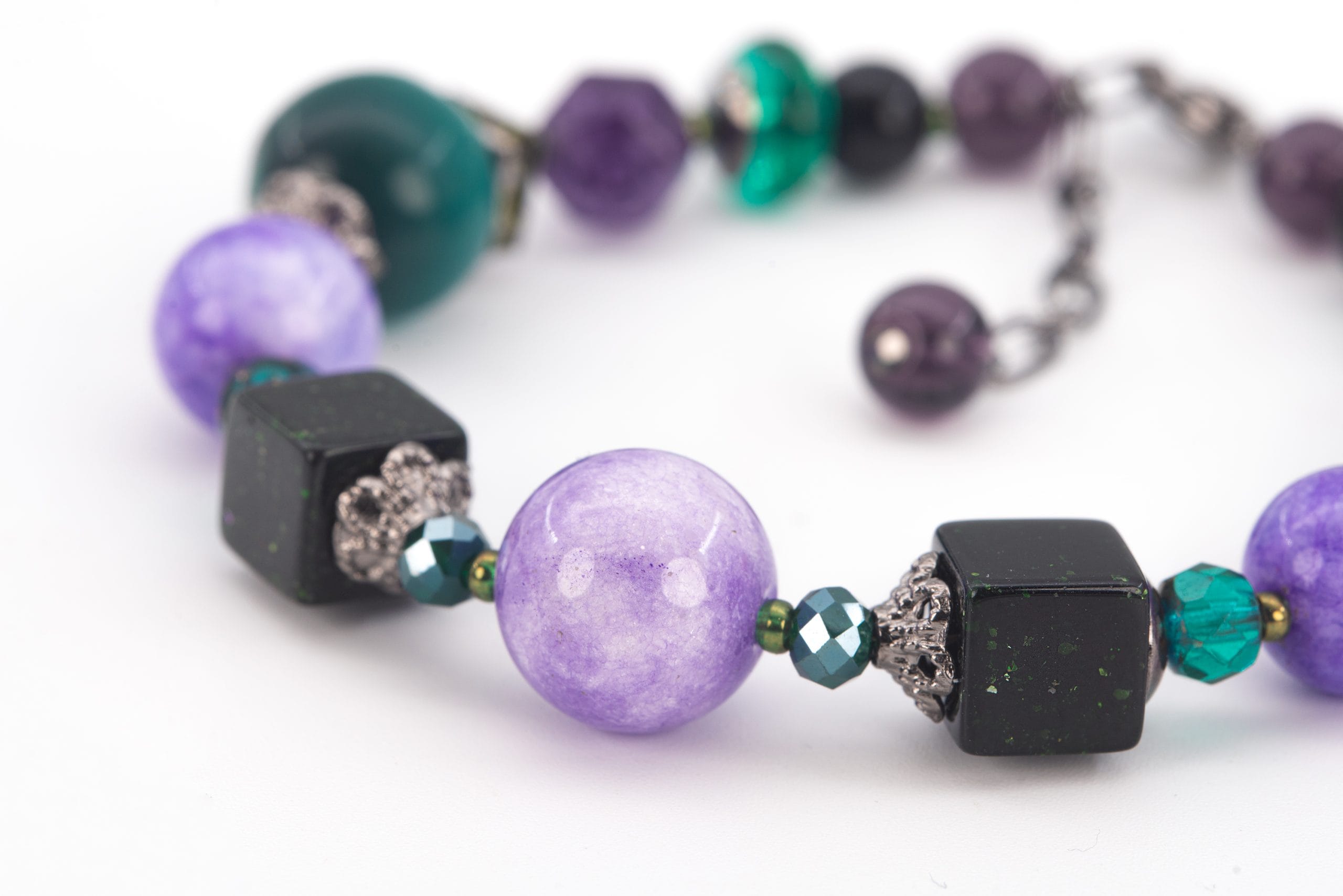 Узор построен на чередовании форм: гладкие круглые бусины сменяются кубами и вытянутыми элементами, благодаря чему украшение выглядит динамично и живо. Металлические декоративные шапочки добавляют лёгкий винтажный акцент.