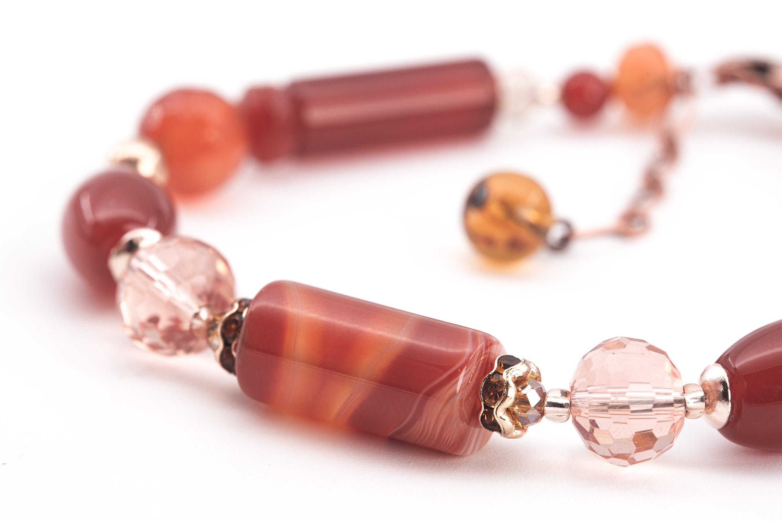 Вытянутые цилиндры чередуются с округлыми формами, создавая спокойный, ритмичный узор. Гранёные вставки добавляют лёгкое мерцание, а золотистые акценты подчёркивают глубину насыщенного цвета. Украшение выглядит благородно и тепло, легко дополняя как повседневные, так и более нарядные образы.