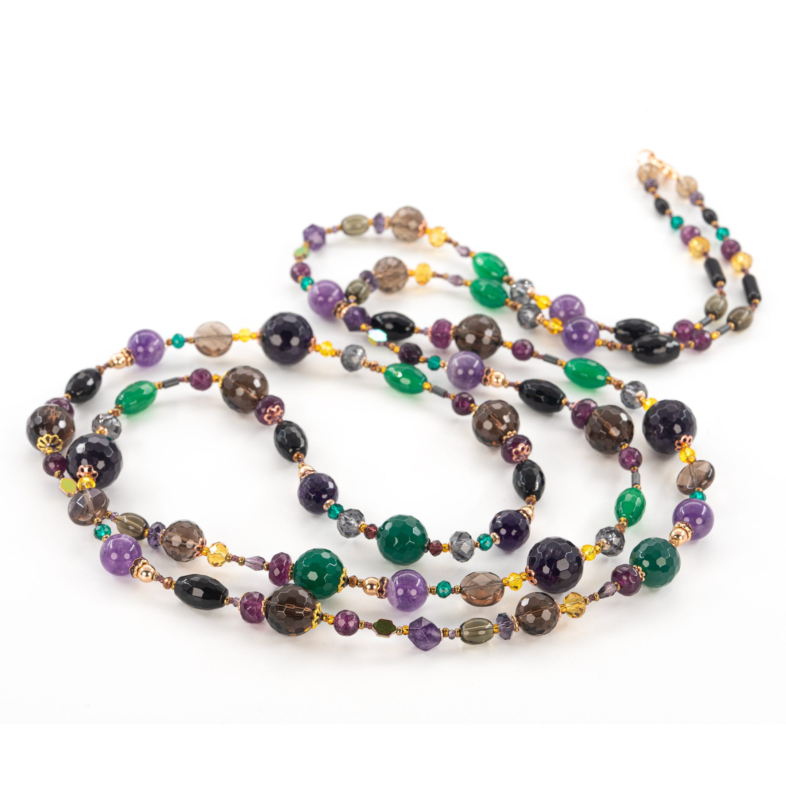 18500 ₽Роскошное длинное украшение из аметиста, раухтопаза, агата и кварца, с золотистой фурнитурой и стразами.