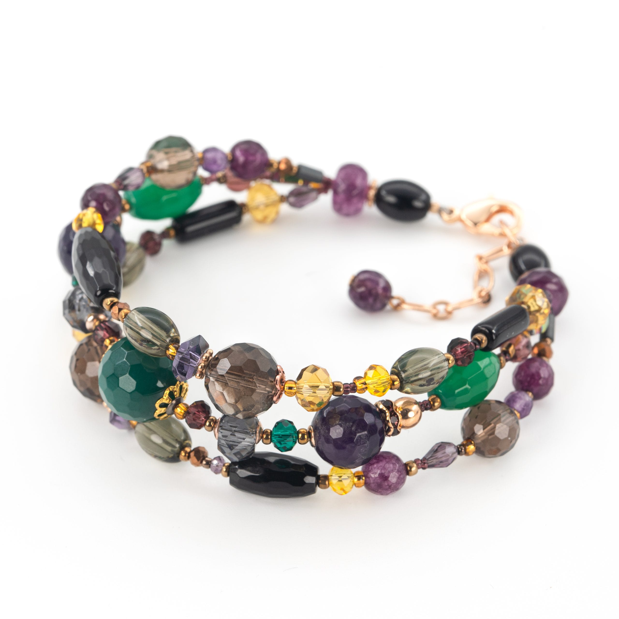 6500 ₽Браслет в три ряда из аметиста, агата, раухтопаза и кварца. Длина браслета составляет 19 см (с увеличением до 22,5 см за счёт цепочки).