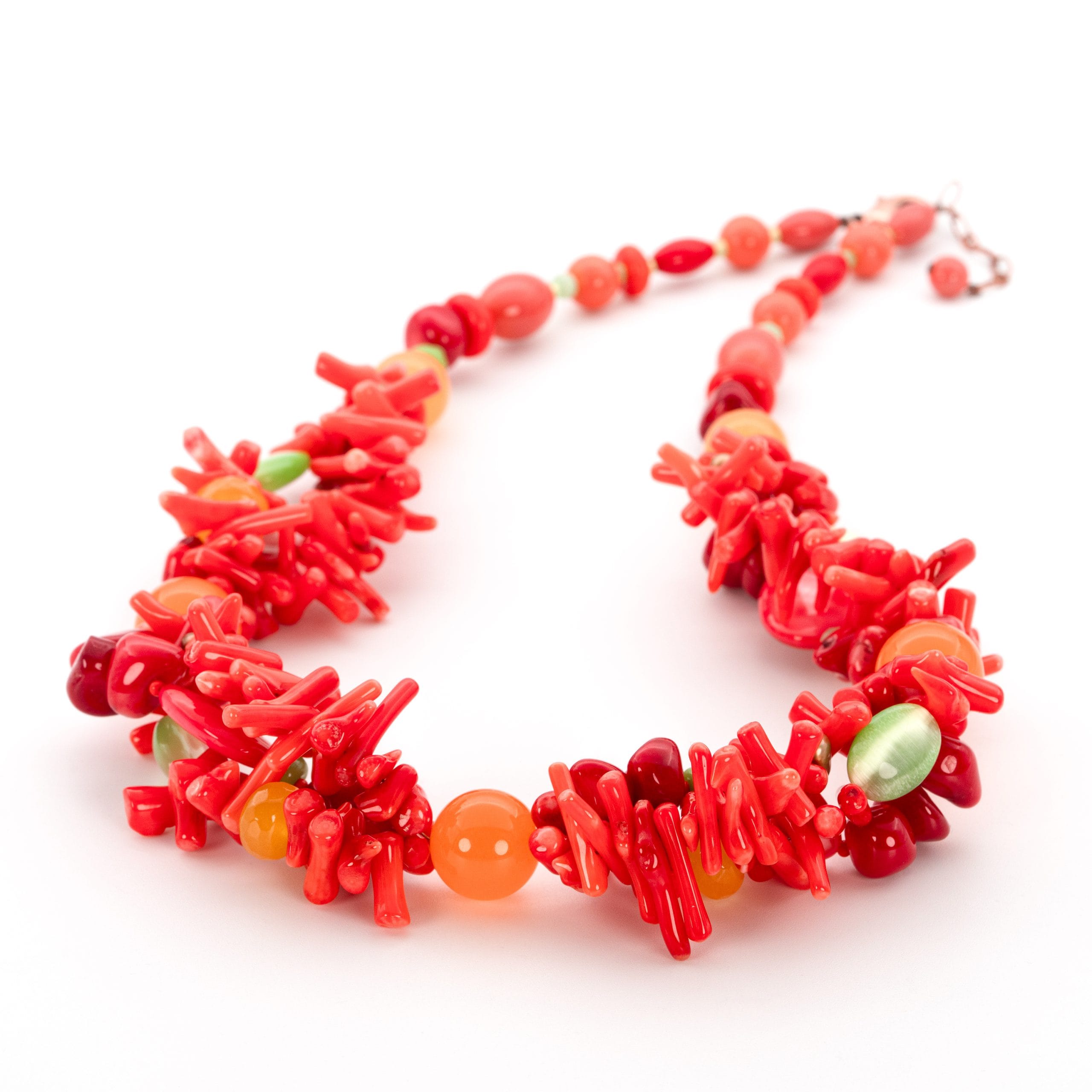 9500 ₽Бусы “Эквадор” — эффектное и яркое украшение, которое сразу привлекает внимание благодаря насыщенной палитре и выразительной форме. Мелкие коралловые элементы необычной, вытянутой формы создают объёмный, живой узор. Композицию дополняют гладкие вставки из кварца, жемчуга и зелёного кошачьего глаза, добавляя контраст и игру фактур. Длина украшения 53 см, плюс цепочка 3,5 см.