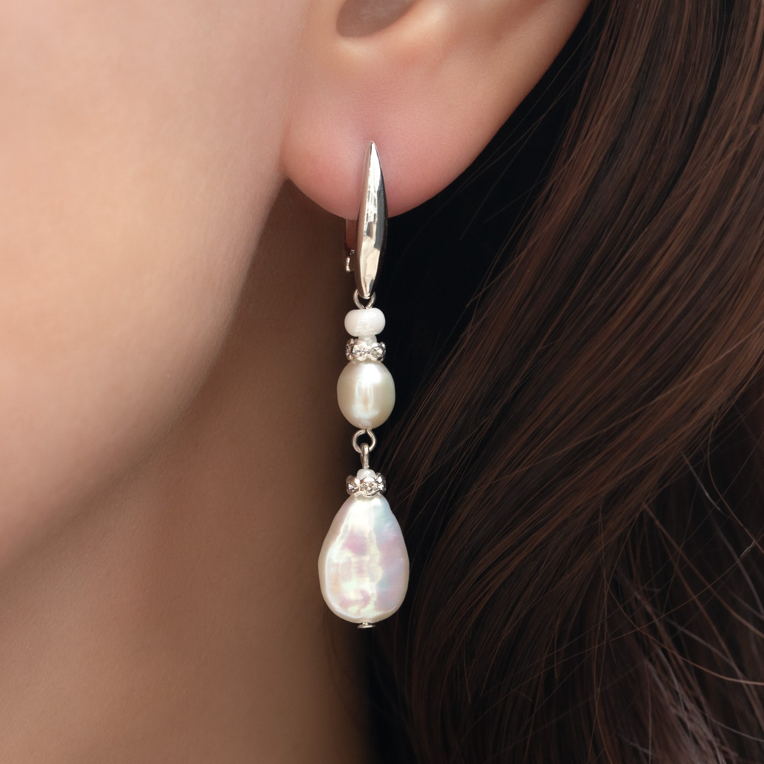 Длинные серьги из бусин натурального жемчуга, на английских замках, с палладиевым покрытием. Длина серег 4,9 см.