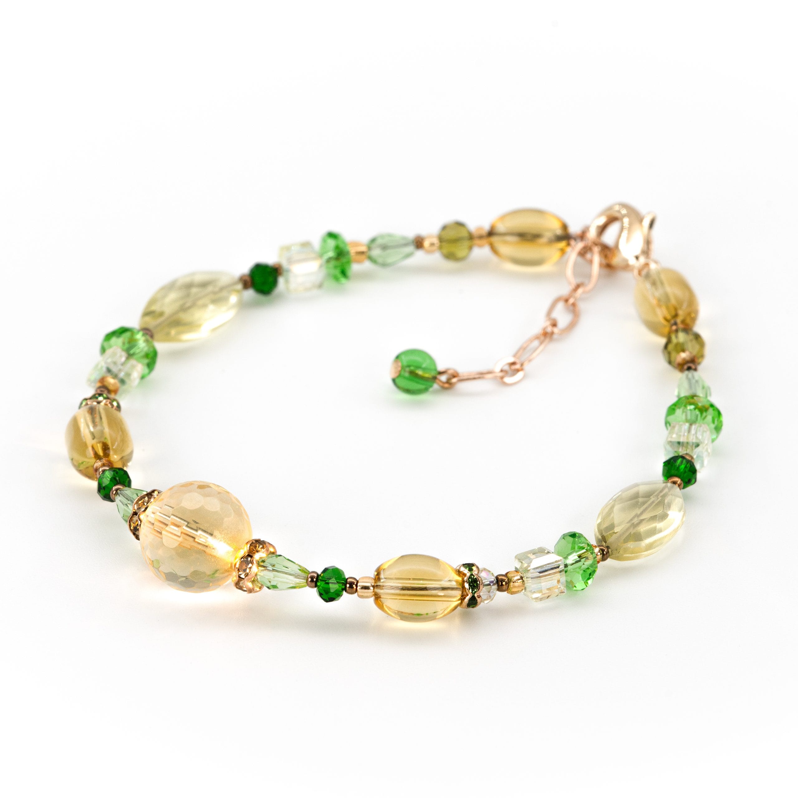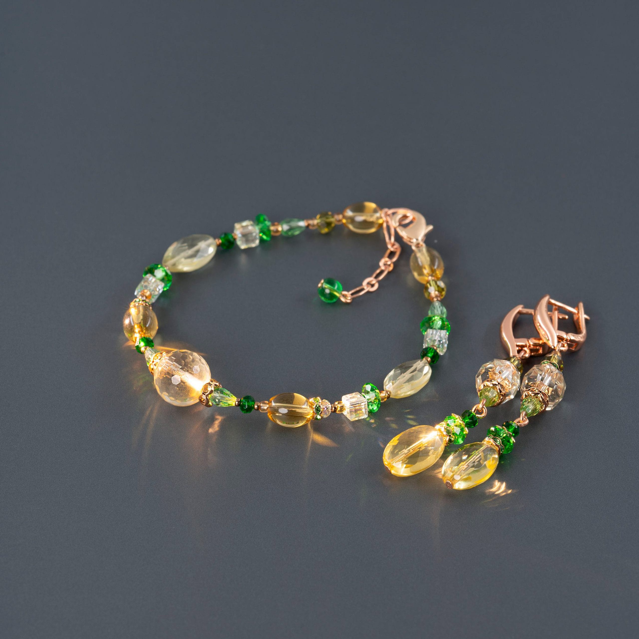 5000 ₽Браслет с лимонным кварцем, изумрудными вставками, стразами и бисером создан для тех, кто ценит яркие акценты и ручную работу. Сочетание солнечного кварца и зелёных деталей делает украшение универсальным: оно легко дополнит как лёгкое платье, так и строгий костюм. При покупке набора украшений цена на 10% выгоднее, чем по отдельности.
