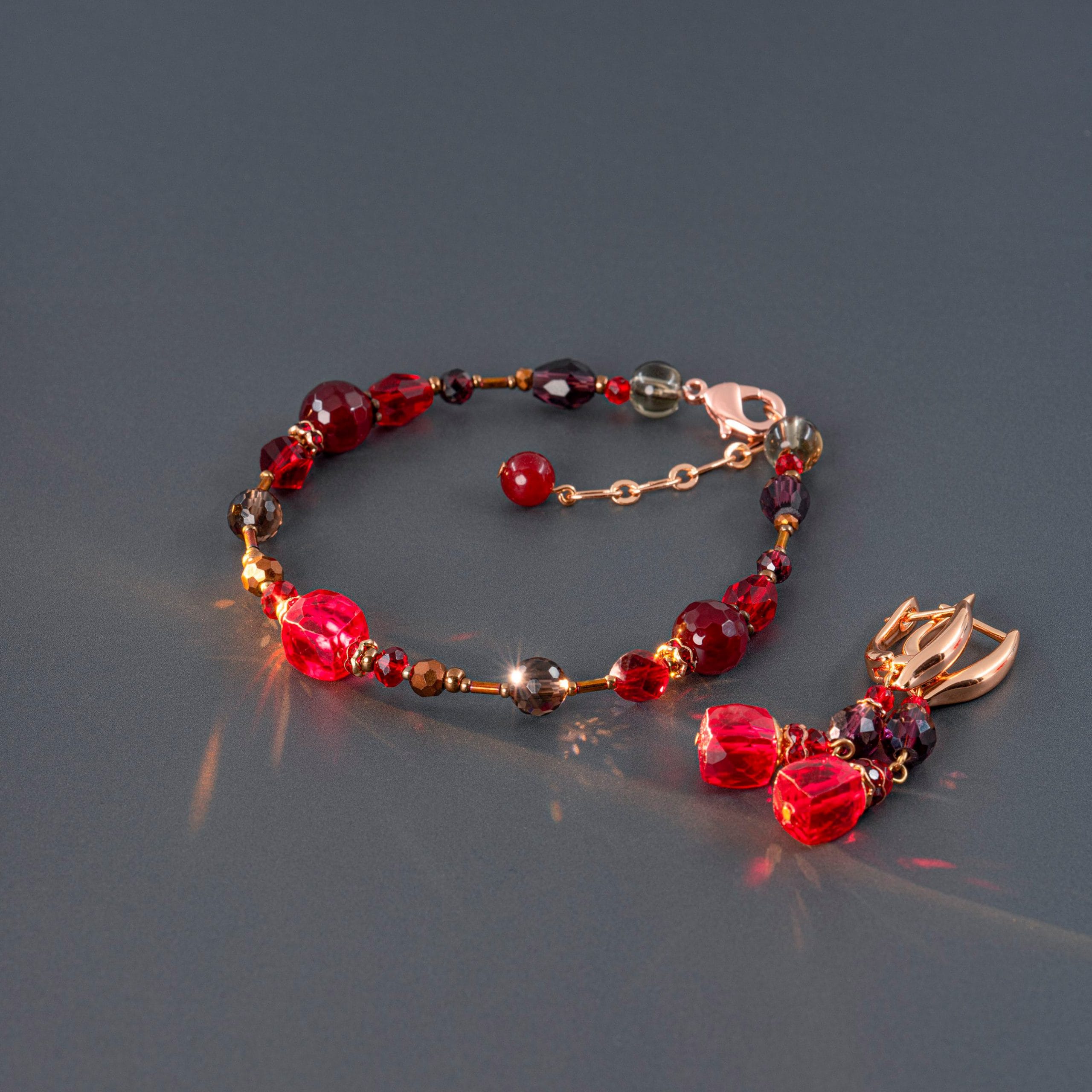 10350 ₽Элегантный комплект из браслета и серёг, созданный из насыщенного малинового корунда, граната и стеклянных гранёных вставок. Золотистые стразы добавляют украшению сияния и подчеркивают глубину оттенков. Вместе браслет и серьги образуют гармоничный ансамбль, который выглядит особенно выразительно. К тому же набор выгоднее — его цена на 10% ниже, чем при покупке изделий по отдельности.